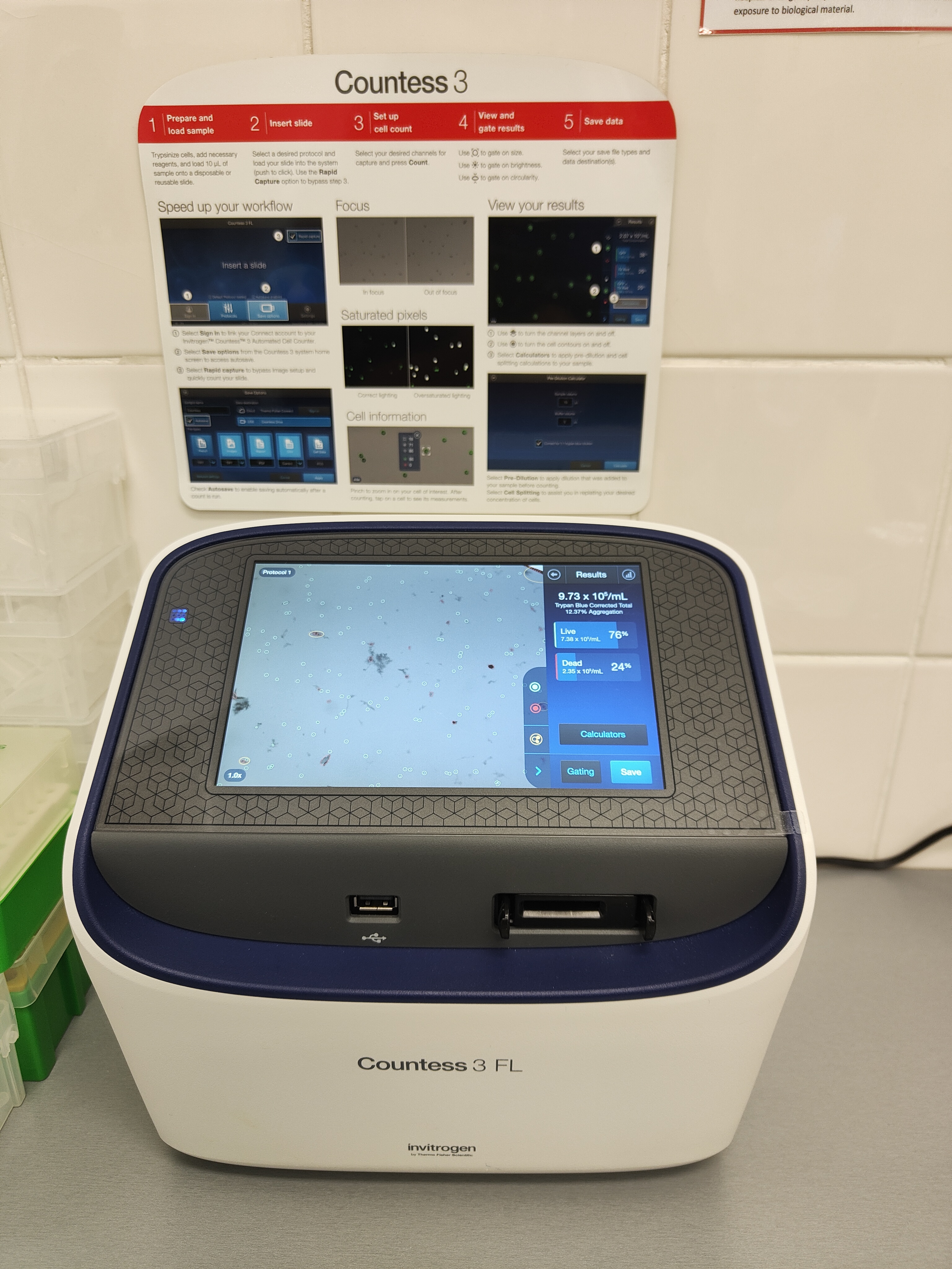 The Countess 3 FL Automated Cell Counter is a benchtop brightfield and fluorescence cell counter with advanced optics, automated focus and lighting, and image analysis software for rapid automated cell counting. Two fluorescence channels are available: Tagi: Imaging, Culture |
